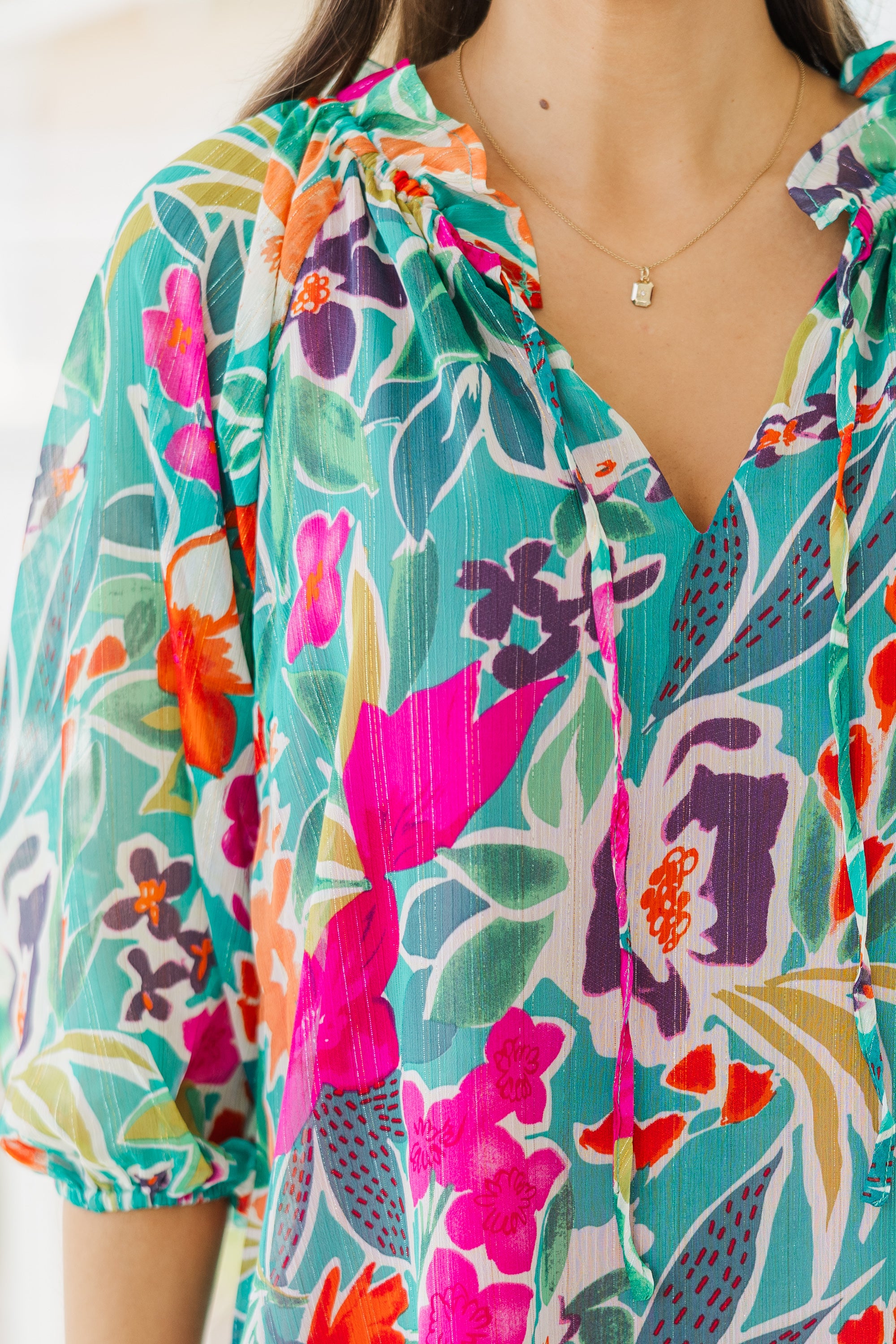 This blouse just feels like you! That floral print is so pretty and we love how bold it is! This bubble sleeve blouse is so chic and is going to look fabulous on you! It's going to be perfect for a day at the office, shopping, or anything in between!